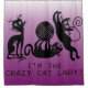 Cortina de chá com três gatos pretos brincando com uma bola de fio e texto preto que diz que eu sou a Lady Gato Louca!