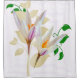 Este trabalho de arte de cortina de chá apresenta delicados elementos florais semelhantes a croco, emoldurados por veias beges e vinhas verdes, com folhas brancas translúcidas acrescentando profundidade e textura contra um fundo de linhas concêntricas, em forma de quadrado, criando um contraste elegante.