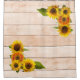 Toda a beleza difícil dos girassóis amontoados num canto de um fundo de madeira rústico. O design contém ocres mudos, amarelos vibrantes brilhantes, cor-de-rosa e verde