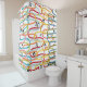 Esta cortina de chá tem um design moderno do século médio de rabiscos correndo verticalmente em cores retrógradas com estrelas pretas e círculos espalhados sobre a design.