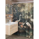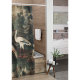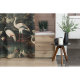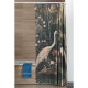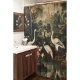 pintura botânica vintage de guindastes em pé num lago cercado por lindas flores exóticas com palácio ao fundo