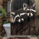 Dois guaxinins bebês espiando de um buraco em um velho carvalho.