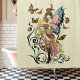 Uma fada loira Steampunk com asas rosa e azuis. A fada está vestindo roupas bonitinhas com chapéu de cima, corset e estrias, Borboletas, relógio, engrenagens e design tribal num fundo amarelo-claro