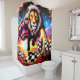 Esta cortina de chá tem um leão pintado nela.