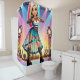Esta cortina de chá tem uma pop estrela com mãos de coração nela.