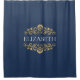 Uma elegante cortina chá azul e dourada de monograma florescente. Adicione seu nome entre o floral dourado floral na frente. Projetado para você pelo Blackberry Boulevard.