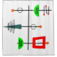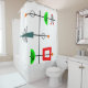 Esta cortina de chá tem um design moderno século médio que se parece com um móvel com meio círculo, retângulo inclinado, triângulo, linhas e círculos em vermelho, verde, verde, cor de rosa, laranja e preto.