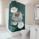 A detailed and naturalistic flat-style illustration of a fire salamander — rendered in dramatic black with vivid yellow spots — crawling across smooth grey rocks, surrounded by elegant white water lilies in a deep teal pond. The high contrast between the salamander's markings and the soft background creates a striking visual. This art piece appeals to nature enthusiasts and collectors of unique botanical and wildlife art.