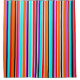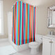 Esta cortina de chá tem um simples design de faixas verticais de espessura variável em vermelho, laranja, roxo, preto, azul claro e branco.