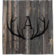 A cortina do chuveiro apresenta madeira escura rústica, chifres pretos e seu monograma.