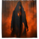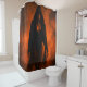 Esta cortina de chá tem uma mulher encapuzada na névoa laranja nela fotografada.