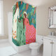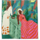 Uma cena tropical vibrante, com duas mulheres elegantemente vestidas, a saltar numa varanda debaixo da lua. Folhagem verde e tons de terra quente criam uma atmosfera serena, mas ousada. Tecidos fluentes e padrões ricos acrescentam uma sensação de movimento e sofisticação sem esforço.