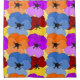 Esta cortina de chá tem um design Primavera de roxo, azul, laranja e vermelho com pansias amarelas colocadas umas sobre as outras num campo de amarelo.