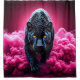 Esta cortina de chá tem uma pantera com fumaça rosa.