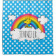 Esta trabalho de arte de amendoim azul e branco apresenta o Woodstock flutuando em um arco-íris e uma nuvem.