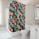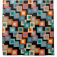 Esta cortina de chá tem um design geométrico de quadrados de dentro em tons mais claros de azul, lacre, laranja, bronzeado, esbranquiçado, manga e cinza num campo de preto.