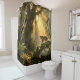 A jaguar pauses on a fallen log, as tropical birds fly overhead in a rain forest. Orchids and epiphytes grow among massive trees as sun shines through the canopy. A beautiful scene, making this the perfect shower curtain for anyone who loves wildlife and nature.