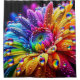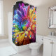 Esta cortina de chá tem uma flor de arco-íris nela.