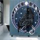 Corvo tribal sentado em um círculo de estrelas e fases luas desenhadas no estilo art nouveau num pano de fundo de blues e roxas