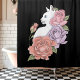 Perfil de um gato branco com rosas cor de pêssego, rosa e lavanda em pano de fundo preto