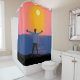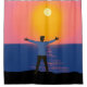 Saudação ao Sol. Um homem está parado numa praia virada para o mar aberto e saudando o sol amarelo com braços levantados.