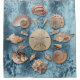 Esta é uma mandala de conchas marinhas sobre fundo de coral azul.