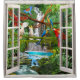Boa vinda à selva enchanted onde a ilusão de uma janela aberta traz a beleza da vida selvagem a seu banheiro enquanto você vê uma variedade de papagaios tropicais que vivem em uma floresta tropical.