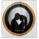 Silhueta preta de casal se beijando com uma lua de cheio brilhante