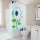Este trabalho de arte de cortina de chá semelhante a girassol apresenta elementos florais contra um fundo branco sólido com pinturas coloridas e linhas diagonais escuras e turquesas, criando uma elegante profundidade e abstrato de contraste de textura.