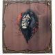 Strength and delicacy united, a black lion in golden light. A majestic lion's face that appears powerful yet elegant. The fur around the muzzle is jet black, creating a stark contrast to the bright yellow, piercing eyes that convey an intense gaze. The lion's mane is dark, but delicate orange blossoms are interspersed within, lending the image a subtle touch of sophistication and vibrancy.