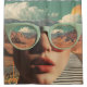 The image is a surreal portrait featuring a woman's face overlaid with a desert landscape. She is wearing light green, retro-style glasses that reflect the desert scene, complete with mountains, clouds, and a large orange sun. A road with black and white stripes runs vertically across the lower part of her face, while a traditional road with yellow flowers lines the left side.