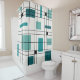 Um padrão moderno de abstrato do século médio com linhas pretas e formas quadradas e retangulares coloridas em tons de lacre e turquesa.