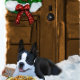 O adorável cachorrinho de Boston Terrier está guardando os biscoitos enquanto aguarda a chegada de Papais noeis na véspera de Natal.