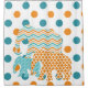 Cortina de chá com três elefantes em azul, laranja e branco em padrões, incluindo faixas diagonais e faixas de diafragma sobre fundo branco com grandes bolinhas de azul e laranja.