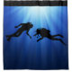 Linda cortina de chuveiro cênica em um design gráfico que retrata uma cena submarina com mergulhadores e luz solar brilhando através do oceano. Projetado para quem ama ou pratica mergulho.