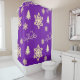 Uma design de decoração colorida de Natal, com flocos de neve, árvores de Natal e espirais espalhados por um fundo roxo festivo.