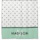 Esta cortina de chá e na moda apresenta bolinhas pretas e brancas, com uma borda inferior em verde-menta. Personalize com seu nome e inicial.