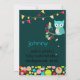 Coruja bonita, azul-aqua num pequeno ramo de flores. Incorporado com bandeiras e bolhas coloridas. O plano de fundo azul verde + chocolate é personalizável. Entretanto, você pode escolher qualquer cor!