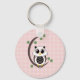 Chaveiro de Botão Básico Personalizado com um design de arte de vetor de uma coruja rosa, branca e preta giro em um galho em forma de lua crescente com folhas e um fundo de bolinhas rosa.