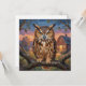 Um cartão em branco para manter contato ou escrever uma nota para alguém que apresenta uma impressionante Coruja Grande, renderizada em um estilo rico e espesso de pintura a óleo em impasto. As texturas vibrantes e o fundo quente do pôr do sol criam uma atmosfera acolhedora e rústica que é perfeita para amantes da natureza e entusiastas da arte.