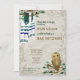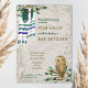 Anuncie o seu Bar Mitzvah com uma sábia coruja e lindos xícaras verdes e azuis de oração pendurados em galhos folhosos. Papel de carta azul e marrom coordenado completa a aparência. A coruja e os ramos verdes folhosos são versáteis para a natureza, a árvore da vida, a floresta rústica, os temas da floresta. O verde, bege e trabalho de arte azul é perfeito para a celebração de aniversário do seu filho. A trabalho de arte de floresta rústica natural também é ideal para uma cerimônia de noivas judaicas para um novo bebê.