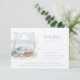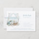 Esta bela placa RSVP de praia apresenta design de aquarela perfeita para o seu casamento de praia de férias. O gráfico de um leito de cabana de praia com o oceano ao fundo. As cores utilizadas incluem: azul de ardósia, verde de floresta, marfim e bronzeado.