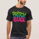 Este design de t-shirt apresenta a frase lúdica "PRITCH PLEASE" numa letra corajosa e colorida. O texto é dividido em duas cores — verde para "PRITCH" e cor-de-rosa para "PLEASE" — criando um contraste vibrante em relação ao tecido preto. A estética geral é casual e humorística, fazer uma reportagem divertida.