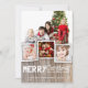O fundo de madeira, violeta e mesclado, e a tipografia tipográfica dão palco a um cartões de natal de campo lúdico para familiares e amigos. Com espaço para uma colagem múltipla de fotos de sua família, este design fotografa três fotos menores e uma foto grande com uma borda de grãos de madeira simulada no fundo e uma pequena samambaia de flocos brancos de neve nas bordas.