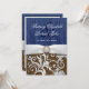 Leather & Denim Damask Western Wedding Invitations. Corresponde às cartas RSVP e mais informações encontradas abaixo nesta página. Cada convite apresenta um impressão de folha floral em gradiente prateado sobre um fundo impresso de couro marrom. A frente e o verso também apresentam uma banda branca impressa com um embelezamento de diamante. Estes convites para o casamento são feitos com um cartão básico de alta qualidade; entretanto, você pode mudar o estoque para linho, feltro (gravado), reciclado e várias tonalidades metálicas se quiser com o número 2 (escolha seu estilo, tamanho e tipo de papel) abaixo do botão laranja adicionar ao carrinho. Também nessa opção é apresentada uma lista dos custos adicionais de uma reserva de cartão mais antiga. Cada convite tem um envelope branco.