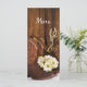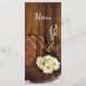 Personalize o encantador Menu de Casamento do País Cowboy Boots, Daisies and Horse Bit com os detalhes da refeição que você servirá no seu tema rústico de festa de noivado, almoço de chá de panela ou janto de recepção de casamento, adicionando a salada ou primeiro curso, entrada ou segundo curso e sobremesa ou terceiro curso. Este menu nupcial sobre o tema equestre, informal mas elegante, apresenta uma fotografia floral acinzentada de um par de botas de cowboy de couro, buquê de flores margaridas brancas e amarelas, colar de pérolas brancas, pedras e rédeas de couro com um fundo de madeira de celeiro de curtumes castanho.