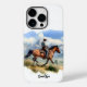 Este design moderno mostra um vaqueiro cavalgando um cavalo de baía com montanhas ao fundo.