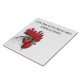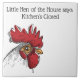 Este trivet/azulejo é mostrado em branco com uma grande cabeça de frango branca e vermelha. O texto diz "Pequena galinha da casa diz que a cozinha está fechada". As cores são branco, preto, amarelo-alaranjado e vermelho no azulejo branco.