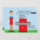 Este é o convite perfeito para começar o churrasco. Este convite é colocado sobre um fundo de céu azul claro com grama ao longo do fundo. Há um homem de pé com utensílios de cozinhar em cada mão e ele está vestindo um avental de cozinhar vermelho. Há um ninho vermelho de gás para ele. Adorável para qualquer festa! ©craftyclip