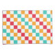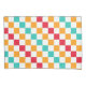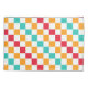 Alternating red, orange, teal, and white squares create a colorful, vibrant checkerboard pattern, conveying an energetic and playful tone.